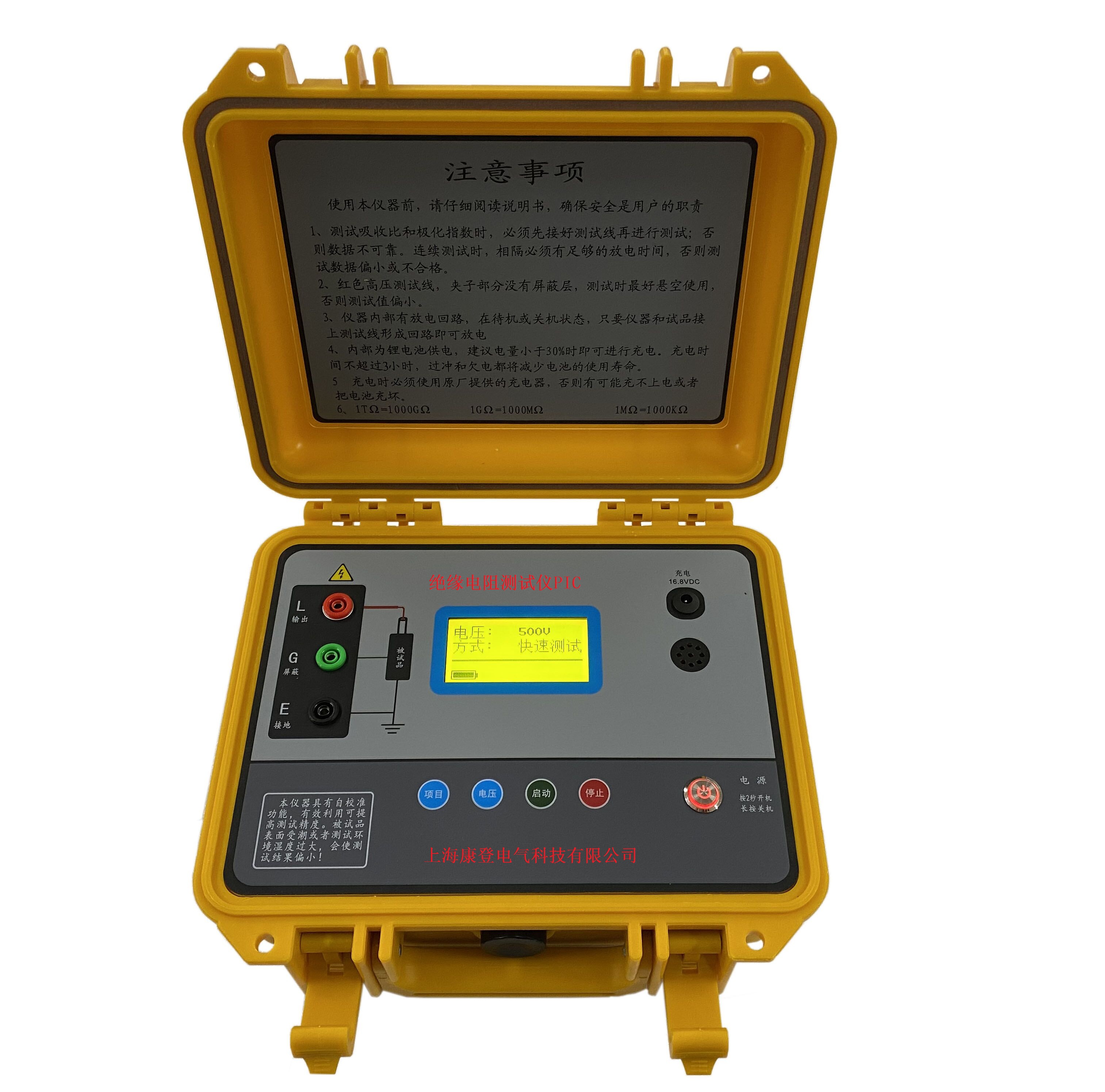 2、绝缘电阻测试仪采用8位单片机控制,全中文操作界面,可自动完成吸收比(DAR)、极化指数(PI)的测量;具有耐压测试、快速测试等功能选项。
